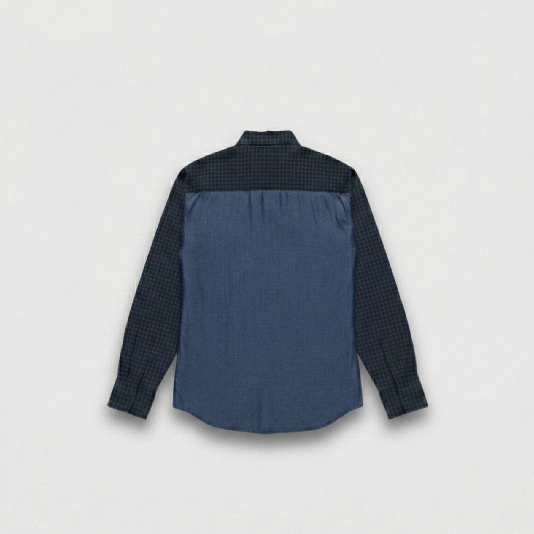 Three shirts walked into a pattern room. Only one came out — and it's this. A fully reworked, multi-fabric utility shirt constructed from three distinct plaids and weaves, each playing a specific architectural role in the final garment.