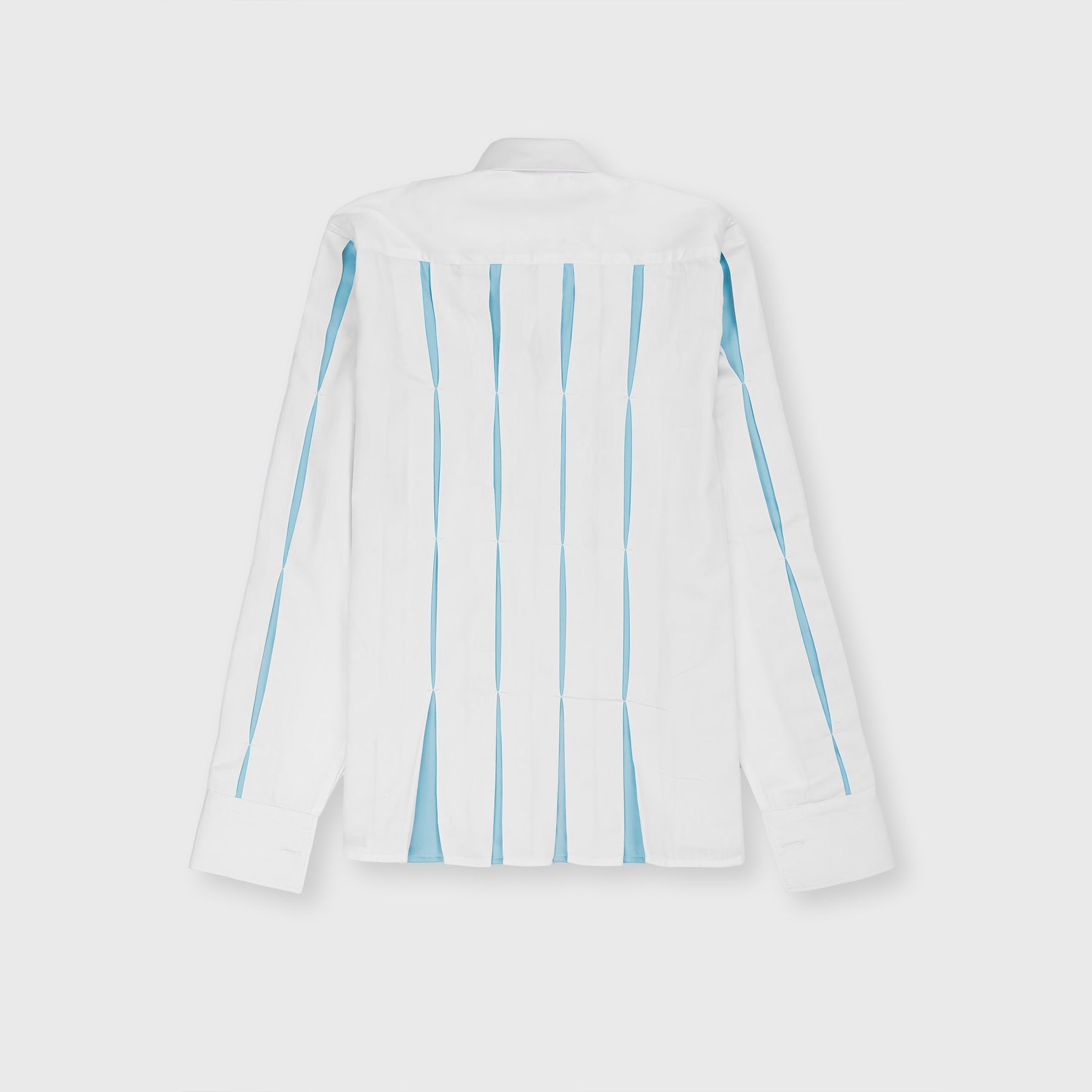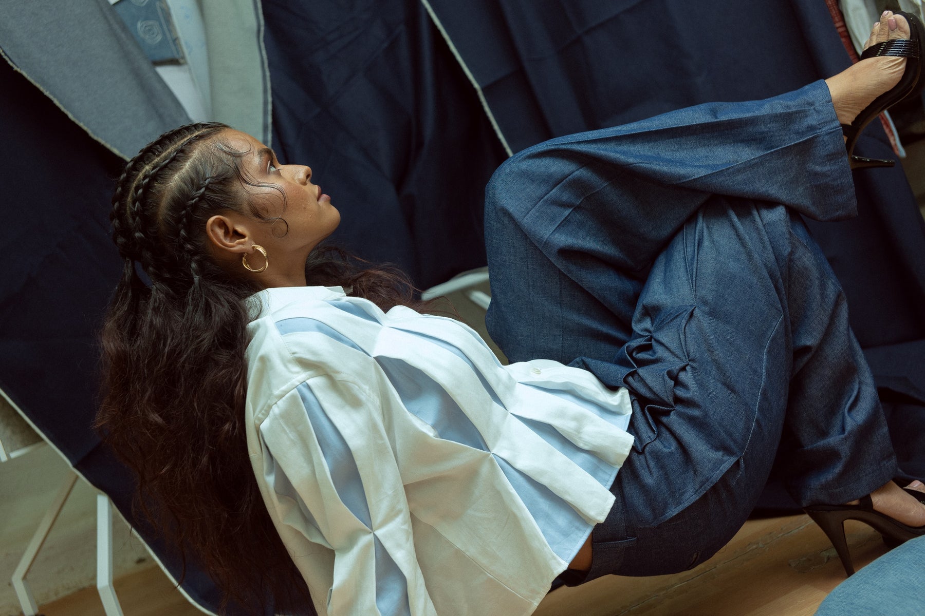 Limited edition cropped shirt with pleated details. Made from upcycled fabric with unique construction. Perfect for pairing with high-waisted bottoms for a contemporary sustainable look.