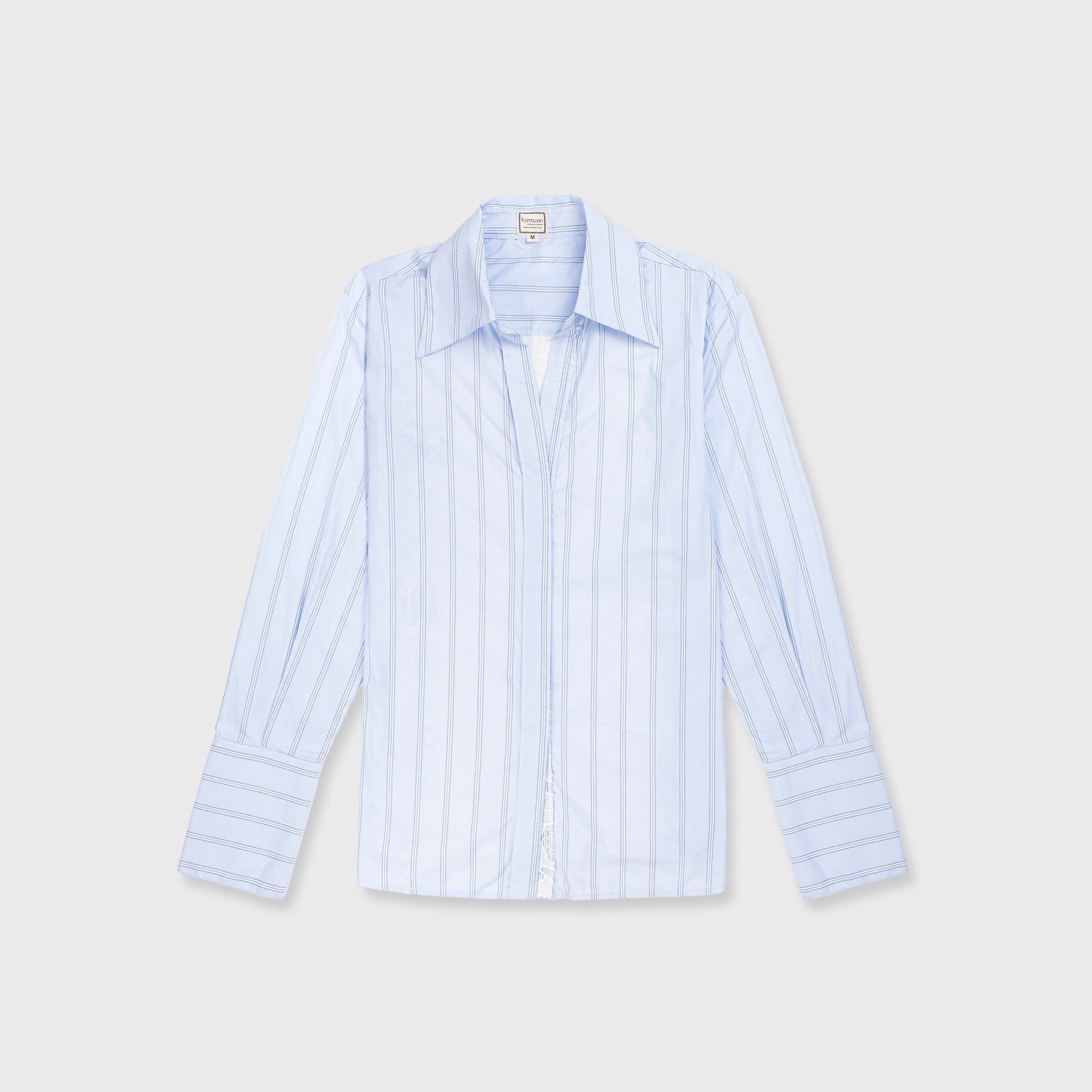 A must-have classic, timeless light blue striped cotton shirt. Pair it with high-waisted trousers for a polished work look, or style it with distressed denim and sneakers for a chic weekend outfit. Finished with elegant lace detailing, this versatile wardrobe essential blends comfort, sophistication, and sustainability.